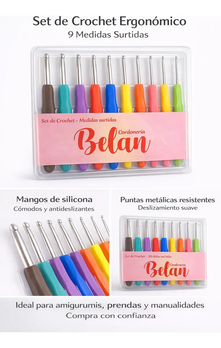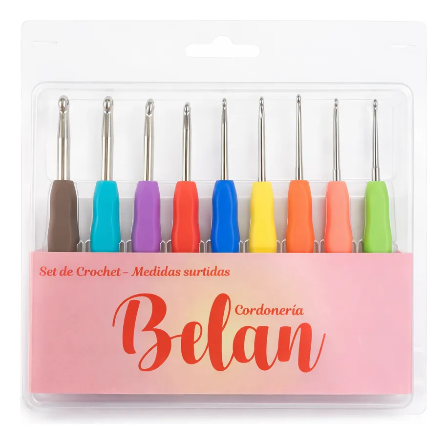 Set de Crochet Ergonómico – Medidas Surtidas Marca: Cordonería Belan Este práctico set de crochet incluye 9 agujas con medidas surtidas, ideales tanto para principiantes como para personas con experiencia en tejido. Características: